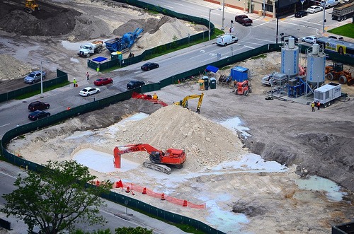 Scope of work: Includes mass excavation from an original ground elevation of 7.00' to -25.00' (32' deep) for foundation excavation and backfill of deep soil mixing plug, relocation of existing water, sewer and drainage utilities to accommodate new building footprint.
