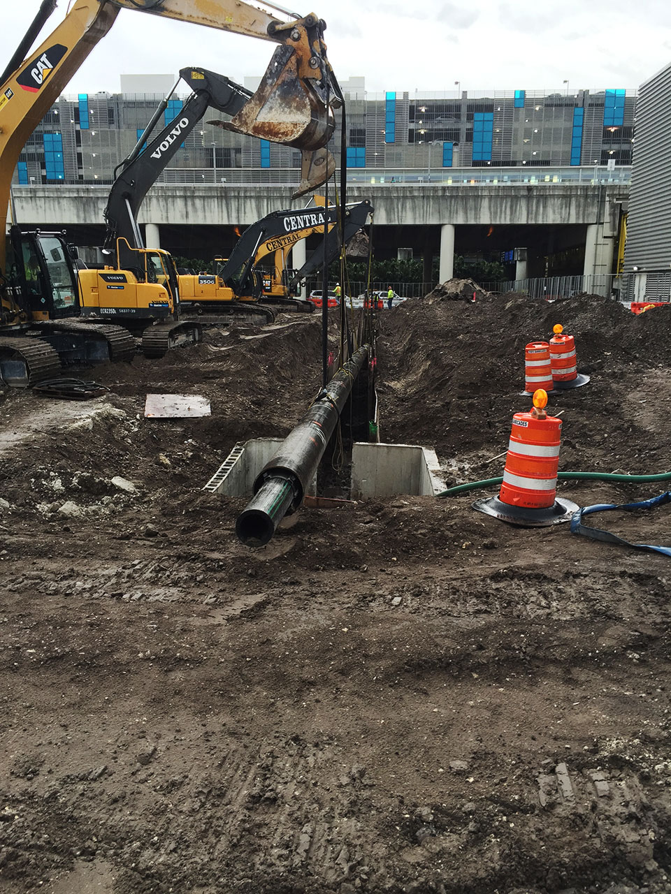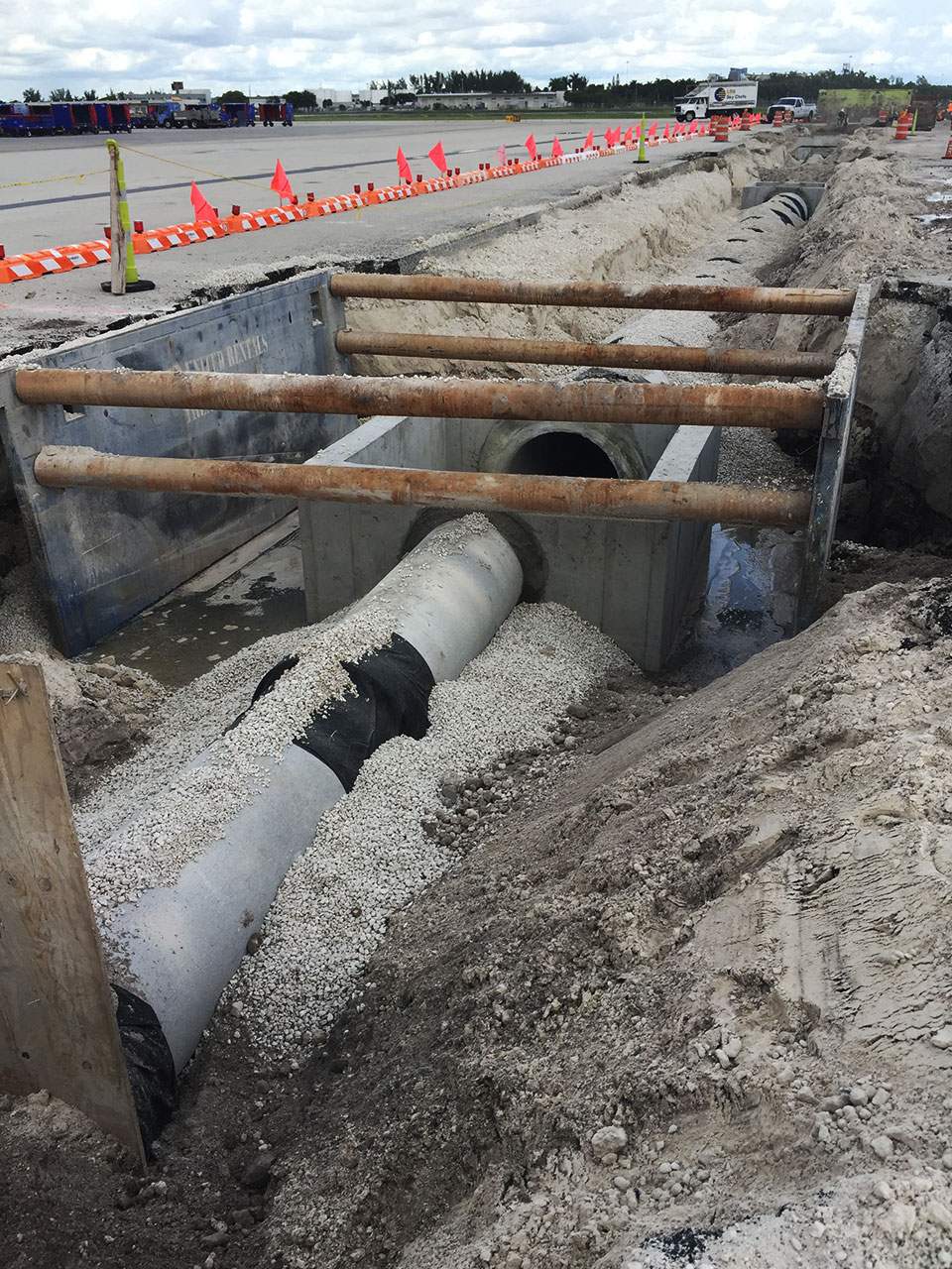 Scope of work: Project highlights include demolition and underground utilities, construction of all new concrete paving in excess of 16" thick with 6" Econocrete and Asphalt aprons per FAA specifications. Maintenance of storm water pollution prevention, maintenance of Airside traffic, including pavement marking. Utility construction in contaminated conditions, removal and replacement of water system, fire system, sewer system, lift station, and storm systems. Major piping including RCP and DIP along with concrete structures with the largest in excess of 120 Tons. All earthwork and disposal of all soil and spoils resulting from demolition work such as pavement excavation for all underground work.