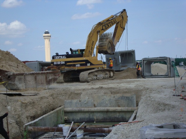 Work to include demolition and underground utilities, construction of all new paving concrete in excess of 18" thick and asphalt aprons per FAA specifications. Maintenance of storm water pollution prevention. maintenance of Airside traffic, including pavement marking. Utility construction in contaminated conditions, removal and replacement of water system, fire system, sewer system, storm systems, lift station and underground duct banks for power and communication. Major piping including 4' x 8' Box Culvert, 24" RCP and 42" DIP along with concrete structures.